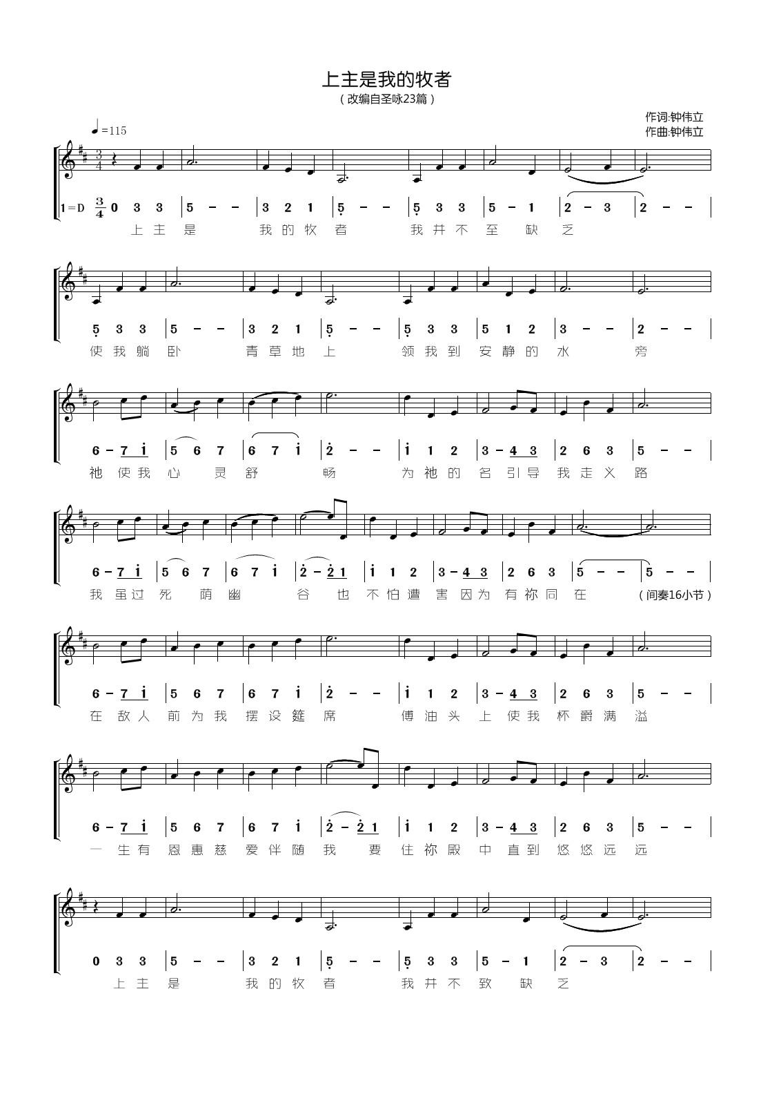 作词:改编自圣咏/诗篇23