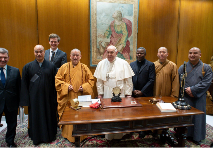 据亚洲新闻网报道, 2月1日上午,教宗方济各在梵蒂冈接见了来自河南省少林寺的僧侣代表团。梵蒂冈新闻网发布的一些照片显示教宗与来自中国河南省的宗教人士一起在书房。