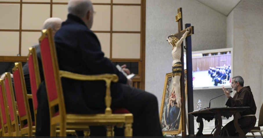教宗府讲道神师帕索里尼神父在保禄六世大厅带领的四旬期避静第二场默想。他谈论了进入天国的标准,强调这不取决于道德表现,而是对他人的爱。