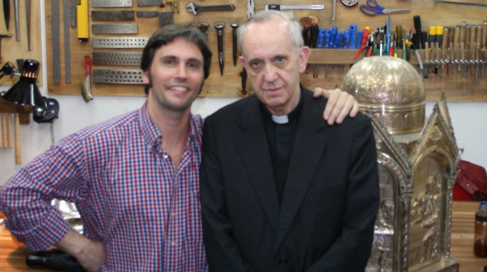 教宗方济各为阿德里安夫妇主持了婚礼,并为他们的孩子方济加和马特奥施洗。这位第七代银匠曾定期与布宜诺斯艾利斯总主教会面,一边享用修女准备的牛奶和饼干,一边探讨神学和艺术。2002年,他们在布宜诺斯艾利斯大教堂修复期间相识,并于2005年共同打造了一个圣爵,并将其赠予当时的教宗本笃十六世。 多年来,双方一直保持着合作。2015年,阿德里安制作了教宗在纽约麦迪逊广场花园主持弥撒时使用的圣杯,并于2022年制作了“和平之战”的奖杯。