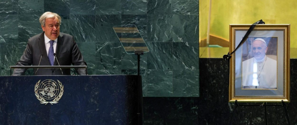教宗方济各于 4 月 21 日复活节星期一去世,联合国以特殊方式向他表示敬意。4月29日星期二,联合国秘书长古特雷斯在纽约向大会发表讲话,赞扬教宗方济各并缅怀他对世界的影响。他说:“教宗方济各是一位有信仰的人,也是所有信仰之间的桥梁建设者,他是地球上最边缘化群体的捍卫者。”此外,古特雷斯坚称,已故教宗“是分裂世界中的团体之声”、“残酷世界中的仁慈之声”和“战争世界中的和平之声”。