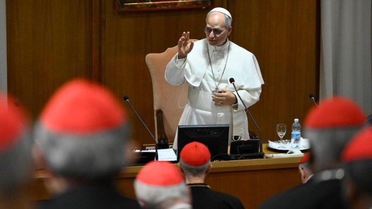 新任教宗邀请众位枢机弟兄陪伴他的宗座牧职道路。教宗指出,他接受的担子“显然远远超过他力所能及的范围,这对任何人来说都是如此”。因此,他需要枢机弟兄们的支持。“你们的临在提醒我,将这使命托付于我的上主,没有让我独自一人承担这项职责。”