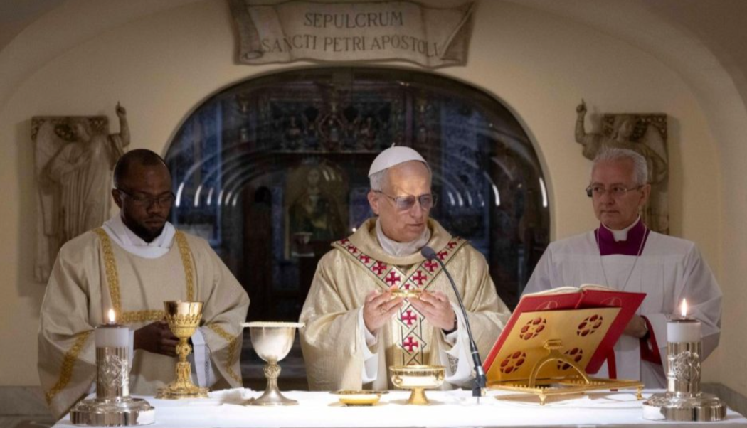 教宗良十四世11日主日上午在圣伯多禄大殿地窟接近圣伯多禄之墓的祭台主持弥撒,然后在众位教宗的墓前和存放羊毛肩带的壁龛前祈祷。