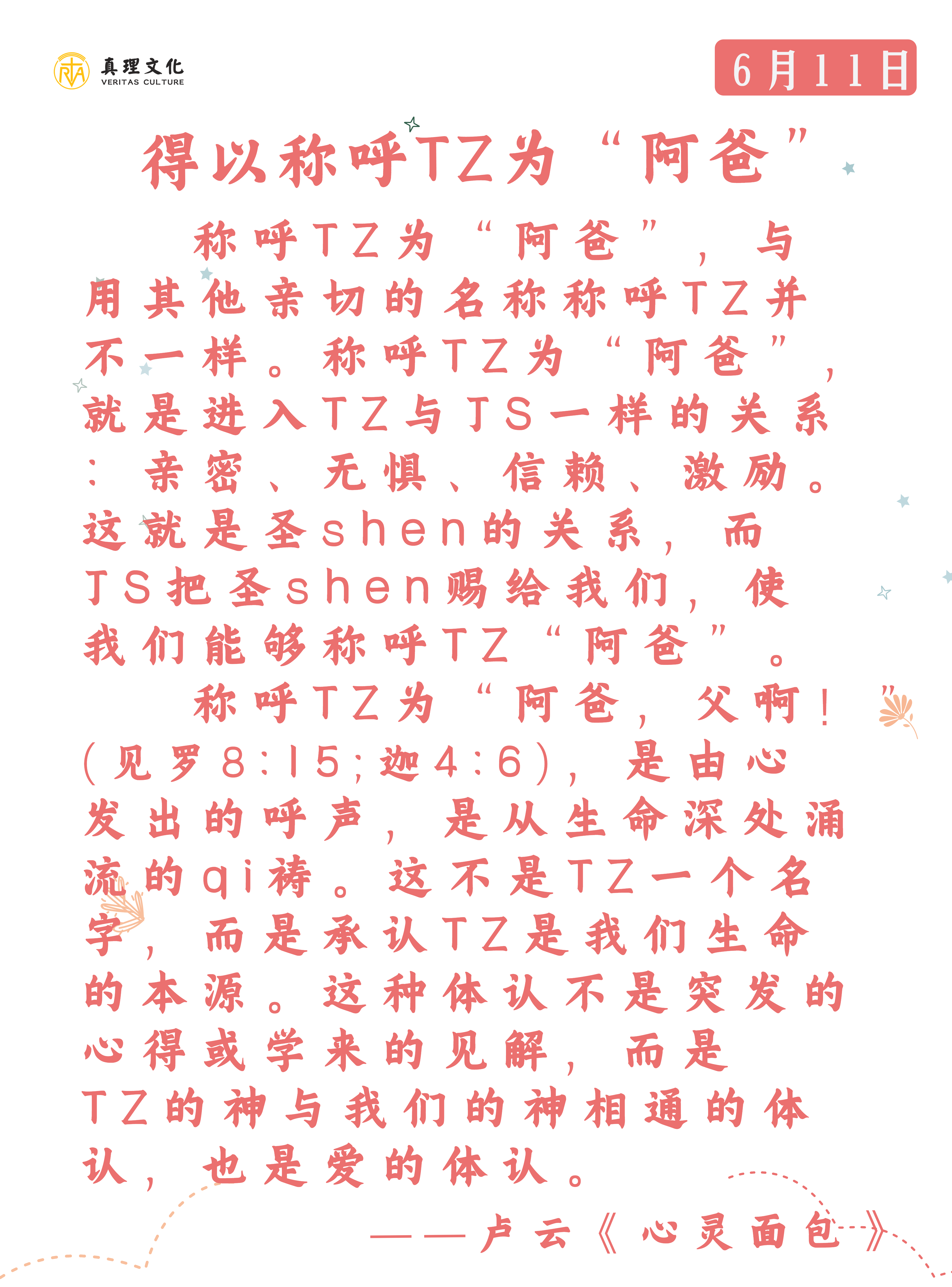 主耶稣基督,感谢祢将天国带给了我们,使我们以最普通的方式与天主相遇,请帮助我们每天在福音中生活,喜乐地传扬祢的圣爱。阿们!