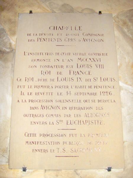 当时在亚维农城的状况也是这样,普通信友看到国王,看到教会神长敬礼圣体的榜样和热情,也纷纷地效仿。慢慢地,当地信友对圣体的热枕慢慢地促成了一个热心善会的成立。这个善会就是“灰衣苦修小兄弟会”,是属于方济各会的一个分支。由于这个善会的会员们都穿灰色的会衣,人们也称他们为“灰衣赔罪会”。 正是在这个圣十字架堂里,会士们轮流着不停歇地朝拜圣体。