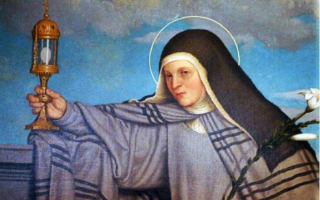 圣加辣最为人熟知的身份是贫穷圣加辣修女会或圣方济第二修会的创始人之一,她与圣方济是好友。这位 13 世纪的圣人因其对圣体的虔诚以及谦卑、贫穷、牺牲和祈祷的生活而闻名。在她的一生中发生了许多有记录的奇迹,其中一个故事是她通过圣体的力量拯救了圣达米盎修道院以及亚西西城。