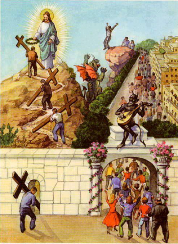 第三,窄门,是在艰难痛苦中做出福音的选择。没有人愿意受苦受难,在信仰中受苦好像是一个不可思议的事,天主怎么没有保护我们呢!然而,所有的艰难困苦都有信仰的价值和意义。主耶稣基督在面对艰难困苦时,祂选择了受苦,而不是妥协或逃避。人所受的各种艰难痛苦,都会使我们成为受过训练的人,并且会在生命中结出正义与和平的果实(希12:5-13)。受哲学上“相对主义”和“享乐主义”的影响,我们常常以各种看似合情合理的借口而牺牲福音的价值,为了团体和个人的享受成功,选择转向期望中的“聪明大道”,希望比其他人更快捷地更舒服地获得现世和天堂的“救恩”。人的每一个投机取巧和踩下他人的选择,最后都要交账还债。
