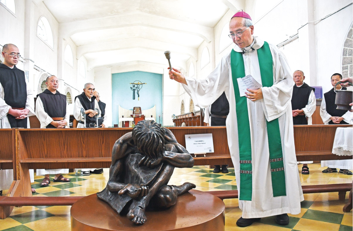 这个人(禧年雕塑) 没有衣服,也没有尊严,需要蜷曲身体令自己不会遭别人进一步侮辱和嘲笑,纵然如此,他竭力伸手求援。教区禧年2025 暨教区成立80周年庆典筹备小组主席夏志诚辅理主教祝福大屿山熙笃会圣母神乐院的“无家者耶稣”系列青铜雕塑当我赤身露体时(When I was naked)时,敦促教友关怀那些遭人剥夺尊严的兄弟姊妹,同时于九月照料受造界时期,爱护遭人类剥削的大自然环境。