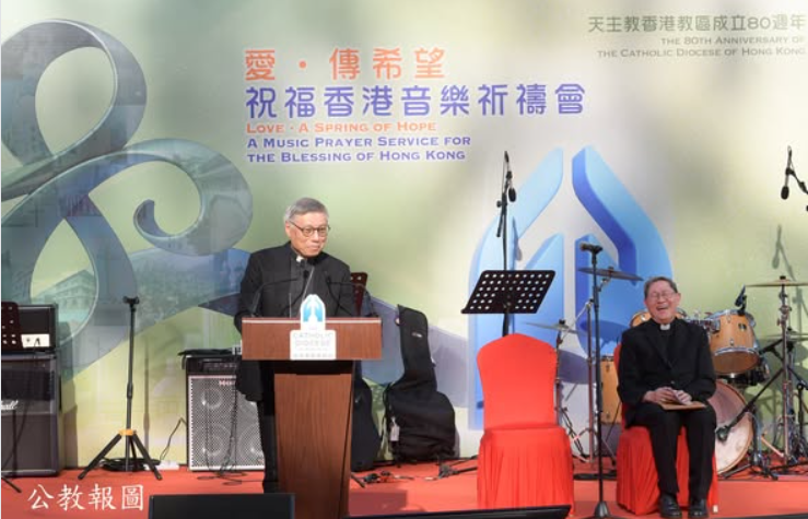 祝福香港庆祝教区成立80周年,香港教区于1月18日下午在中环遮打花园举行“爱・传希望”祝福香港音乐祈祷会,作为香港教区庆祝成立80周年的首个大型公众聚会。香港教区主教周守仁枢机联同圣座福音传播部的塔格莱枢机(Cardinal Luis Antonio Tagle)降福在场信众、官员、社会贤达和市民,将希望带给香港社会。