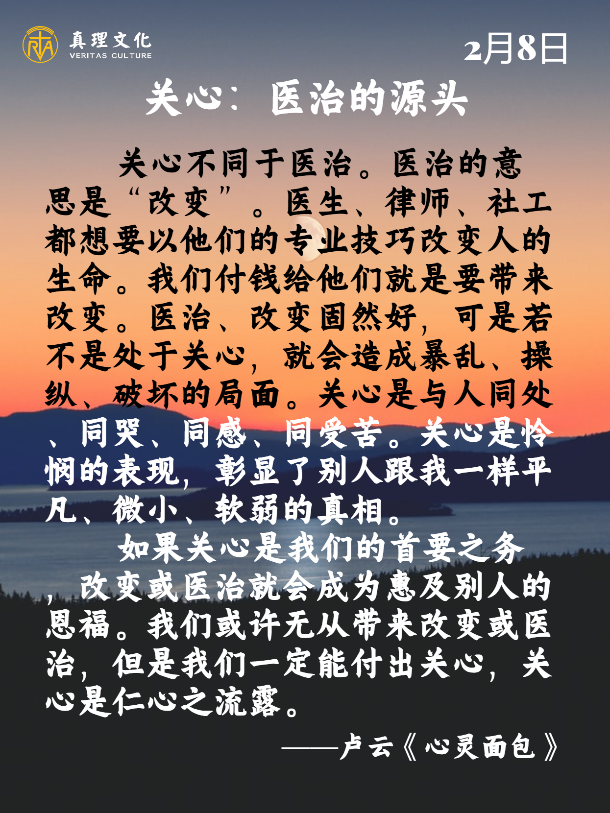 耶稣提醒我们要做「地上的盐、世界的光」,就是帮助我们把个人价值推到更高的层次,让我们看到自己不只是血肉之躯。我们怀着爱的本质,犹如盐所拥有的味道;一旦失去这本质,也就失去了存在的作用。我们既领洗入教,就让天主把我们点燃起来,照亮四方,为这个世界带来希望与方向。