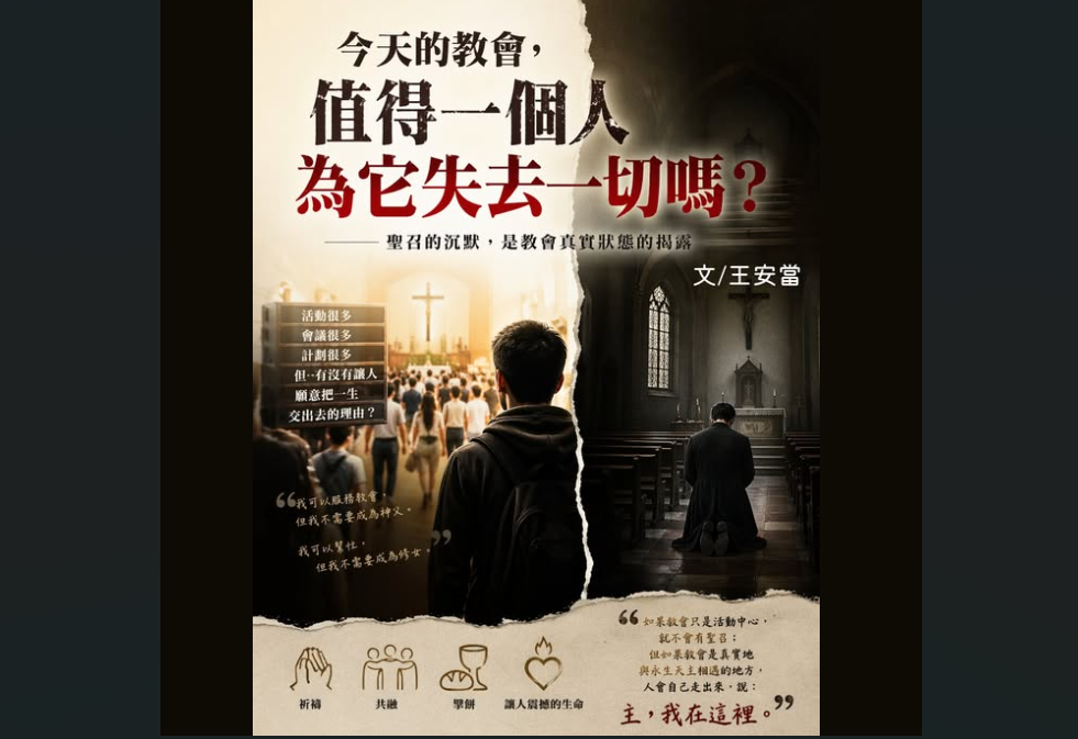 恰逢圣召主日,我想分享一个自己的反省。有一个很真实的画面。主日弥撒结束后,大家走出教堂。有人赶着去吃饭,有人滑手机,有人讨论工作。门口站着一位神父。他笑着送每一个人离开。但没有人停下来问他一句话:“神父,我可以像你一样,把一生给天主吗?”没有。一次都没有。不是因为天主没有召叫,而是因为大部分的人,很难再相信修道生活是值得的。我们很容易说:“现在的年轻人不愿意奉献。”“这个世代太现实。”“世界太诱惑。”但如果我们诚实一点,也勇敢一点,我们大可以说:问题可能不在世界,也许就在教会内。