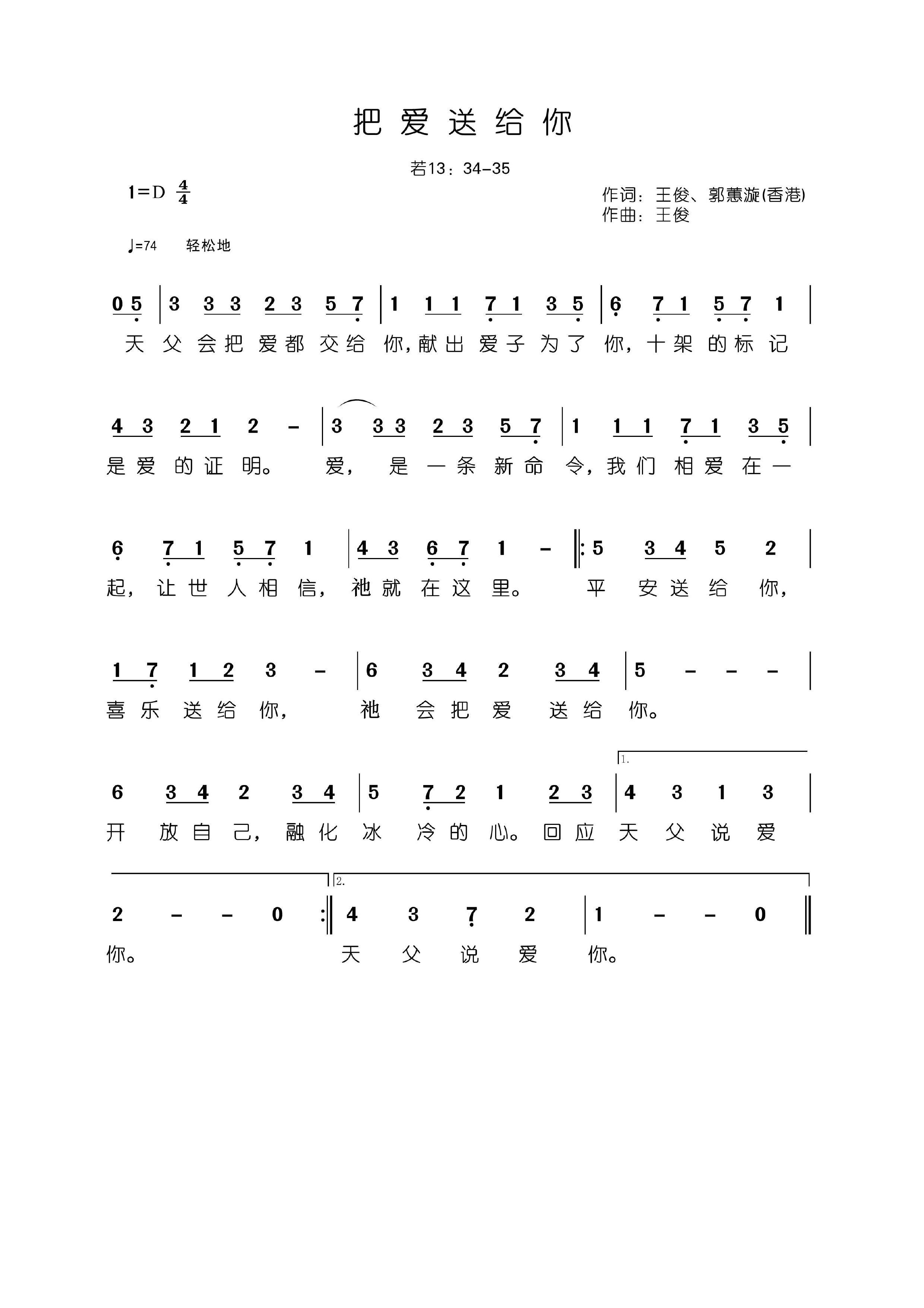 《把爱送给你》:这是一首述说天主是爱的根源,经由祂的爱让我们享有平安和喜乐,也能够分送平安和喜乐给周遭的人们的歌曲。歌词简单,曲风活泼轻鬆可爱,带领人接受天主的爱、平安和喜乐。
