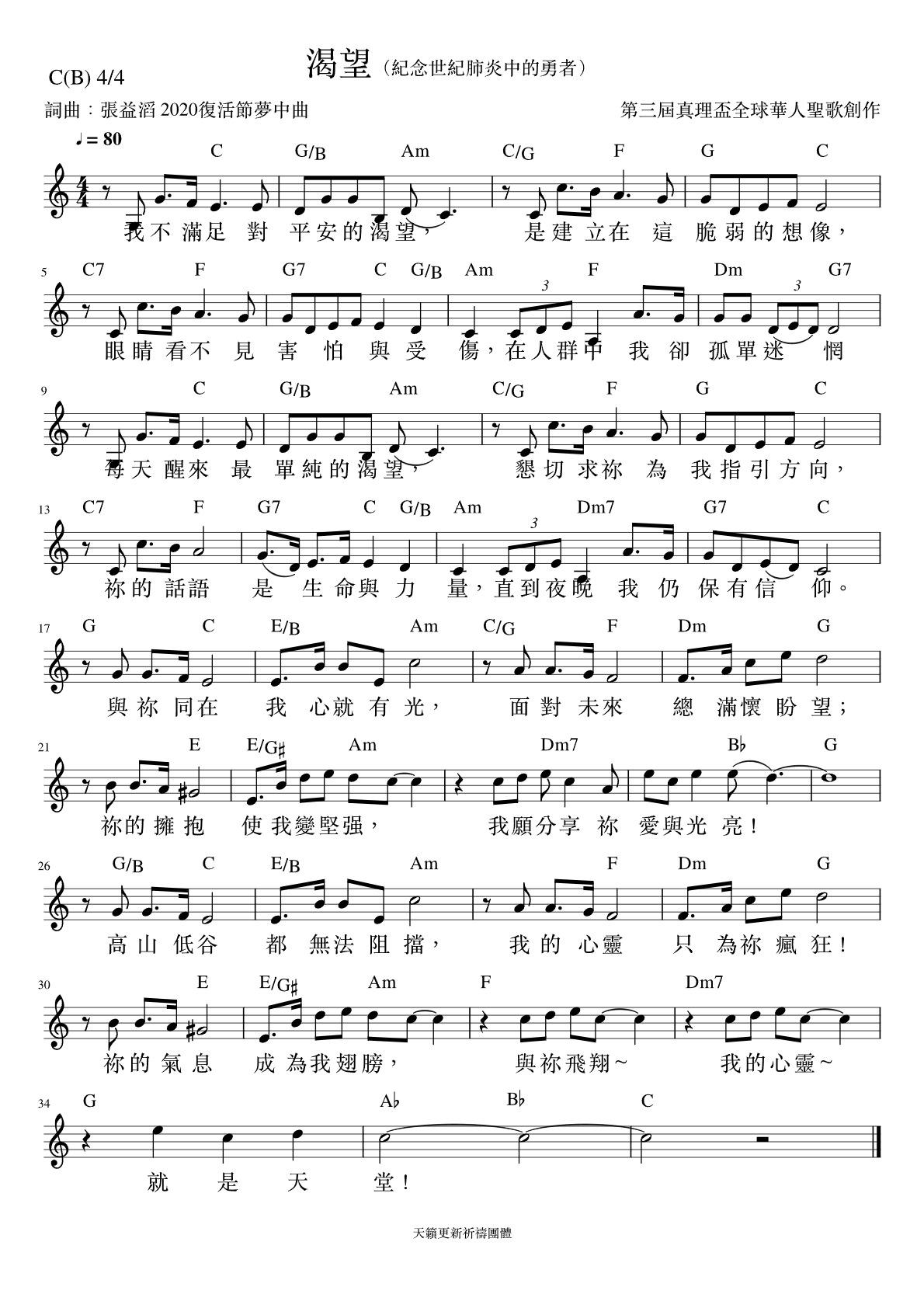 《渴望》是一首纪念世纪肺炎中勇者的歌曲。全世界面对2020年的新冠状疫情都有着无限的恐惧,除了让我们反省人类的恶劣行径,也考验着有信仰的我们如何面对和昇华我们的基督徒生命。歌曲创作者藉由圣经章节的反省灵感,清楚地表达了天主对他的启示,从孤独迷惘、渴望永恆的国度、分享光亮至振翅高飞拥有天堂,歌词和歌曲均有层次性的发展且有能量,在最终达至最高点~天堂。是一首能够振奋人心和令人充满期盼的歌曲。