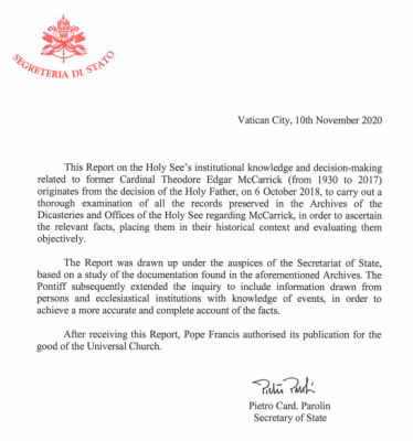 11月10日,圣座公布了对前枢机麦卡里克(Theodore Edgar McCarrick)在制度上的认知和决策过程的报告。这份报告是在教宗的授权下由圣座国务院撰写的,其篇幅很长,用了两年时间才完成。