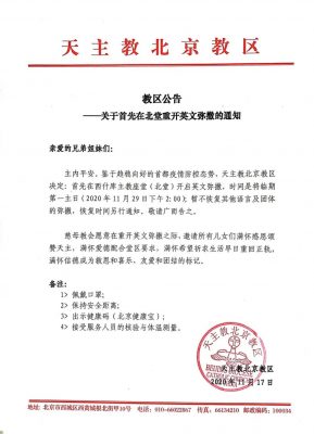 此外,北京教区邀请信友们在重开英文弥撒之际,满怀感恩赞颂天主,积极配合堂区要求,祈求天主使我们的宗教生活早日重回正轨。