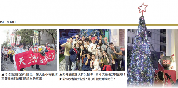 接着,举行了报佳音游行活动。由不同铎区所派出的代表队伍,从南宁街圣若瑟堂步行1.7公里,到达中山路圣母无染原罪堂。在那里,又举行了台南教区圣诞联合点灯及祝圣马槽、圣诞树活动。