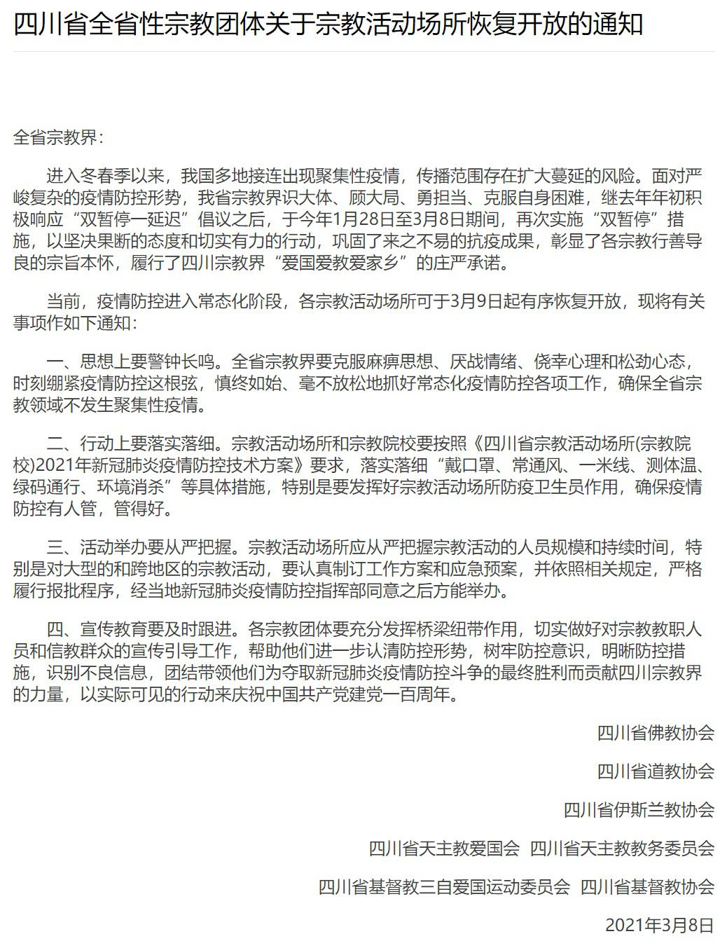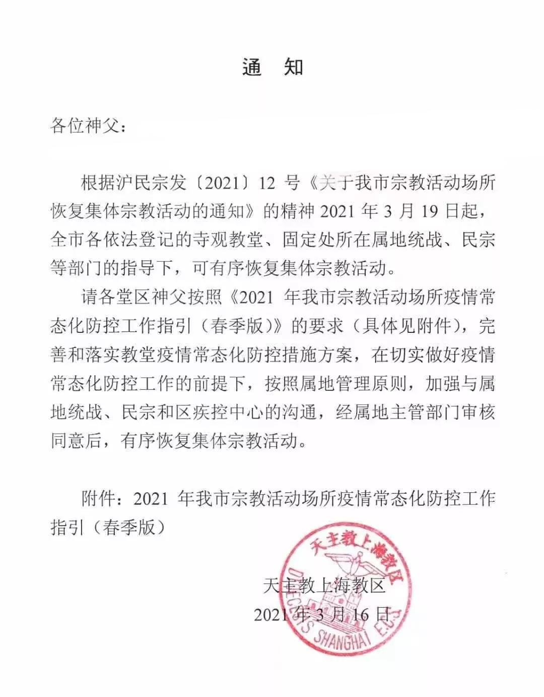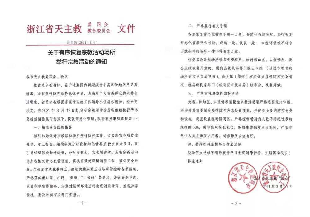 另据教会人士提供的消息,现阶段,四川、浙江、上海、北京等地教会已发出恢复教堂开放的通知,还有部分地区教会正在准备或已启动开放教堂的程序。