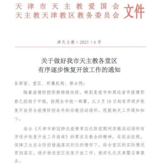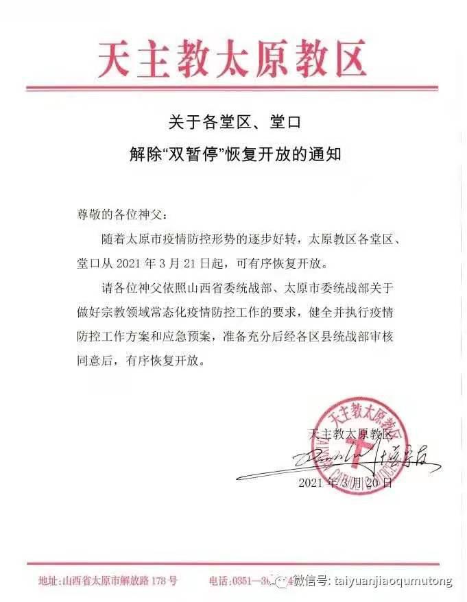 此外,天津、太原、吉林、甘肃、青海、河南等地教会也已收到有序开放宗教活动场所的通知。广东省最迟也将于4月1日起,按之前的常态化防疫措施全部开放圣堂。