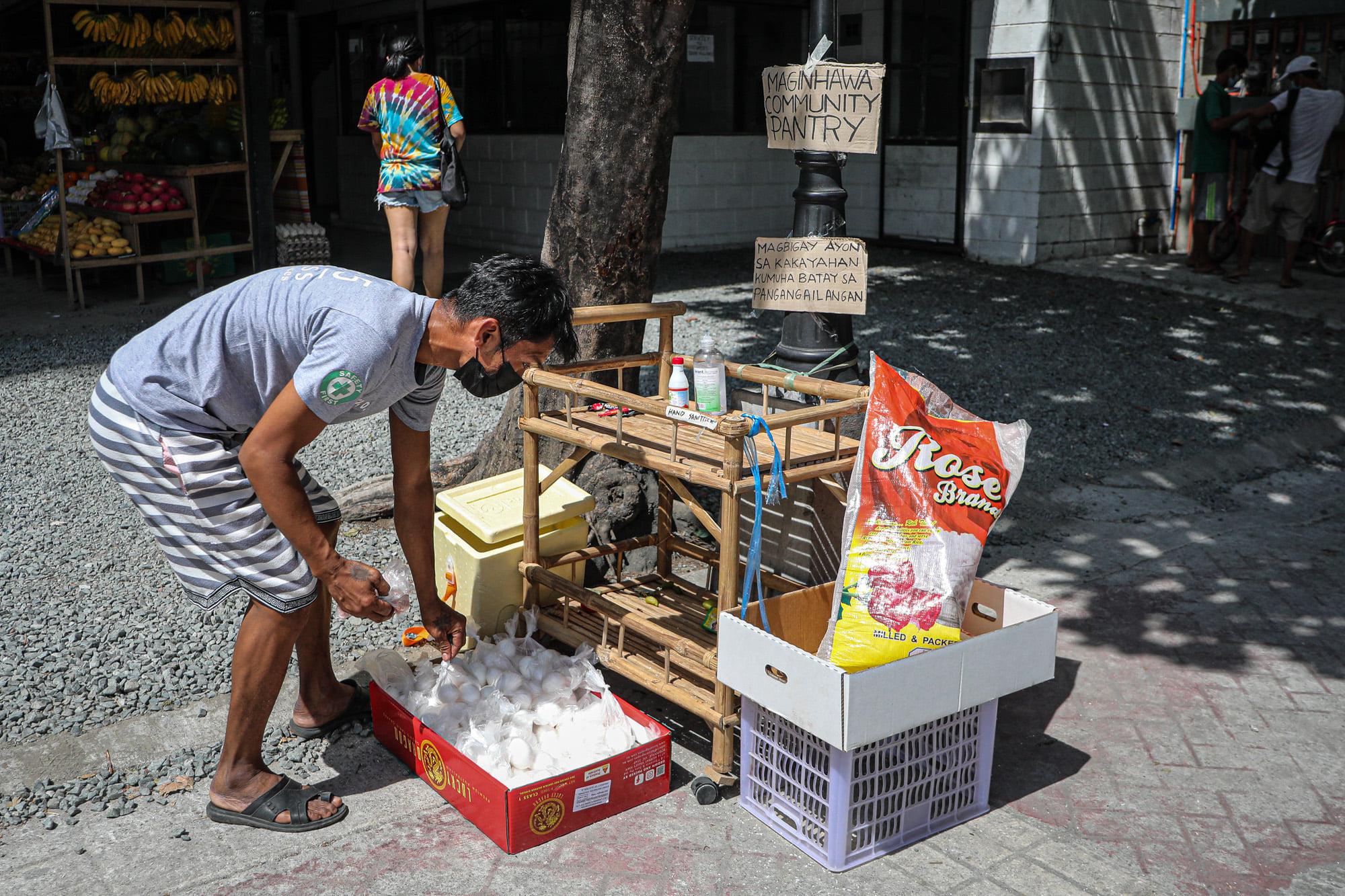 为帮助处于此种困境下的人群,马尼拉马金哈瓦(Maginhawa)街区的一位妇女开始设立“食品流动站”,人们可以在这里拿走自己所需的生活物资,同时按照自己的能力,将自己富余的物资留在这里。