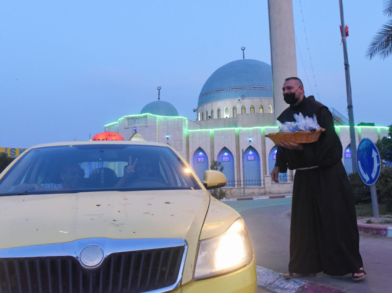 和过去的九年一样,今年穆斯林斋月期间,圣地耶里哥拉丁礼善牧堂本堂、方济会会士哈奇蒂(Mario Hadchiti)神父每天晚上在善牧堂前的马路上,为刚结束一天守斋的穆斯林兄弟姊妹们提供小袋红枣和饮用水。