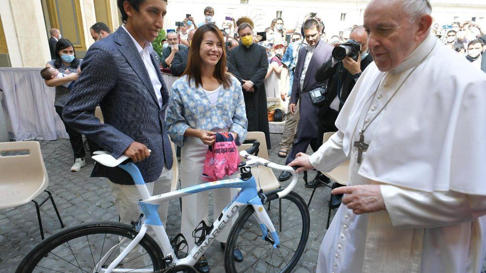 在6月16日周三公开接见活动结束之际,教宗方济各接见了环意自行车赛冠军哥伦比亚自行车运动员伯纳尔(Egan Arley Bernal Gómez)。接见结束后,伯纳尔对记者们说:“我是一名天主教徒,在最艰难的比赛之前我都会祈祷”。
