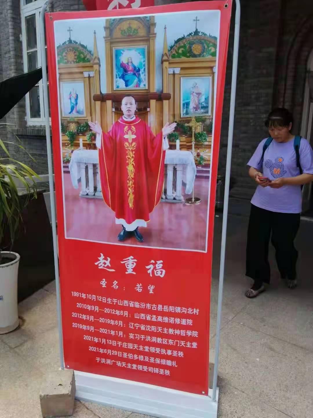 新铎:若望·赵重福,1991年10月12日出生于山西省临汾市古县岳阳镇沟北村;2010年9月至2012年6月就读于山西省孟高维诺修道院;2012年9月至2019年6月就读于辽宁省沈阳天主教神哲学院;2019年9月至2021年1月实习于洪洞教区东门天主堂;2021年1月13日于庄园天主堂晋升执事;2021年6月29日在洪洞广场天主堂晋铎。