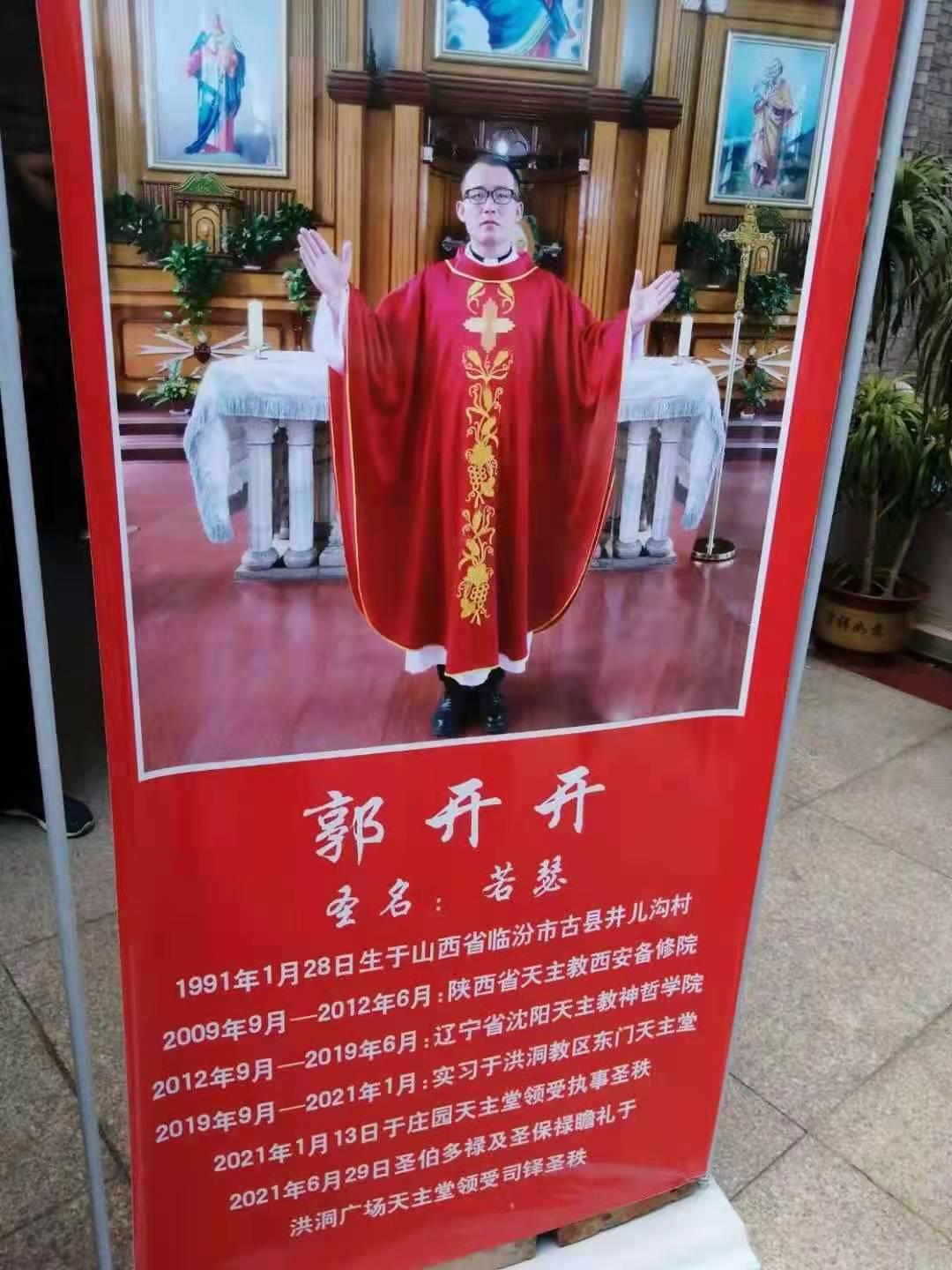 新铎:若瑟·郭开开,1991年1月28日出生于山西省临汾市古县井儿沟村;2009年9月至2012年6月就读于陕西省天主教西安备修院;2012年9月至2019年6月就读于辽宁省沈阳天主教神哲学院;2019年9月至2021年1月实习于洪洞教区东门天主堂;2021年1月13日于庄园天主堂晋升执事;2021年6月29日在洪洞广场天主堂晋铎。
