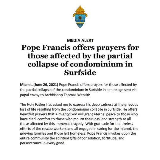 在事件发生后,教宗方济各亦通过圣座驻美国大使向迈阿密总教区温斯基(Thomas Wenski)总主教,表达了对当地人民的关怀之情。温斯基总主教在一份声明中指出,教宗哀悼在这起事件中遇难的人们,并衷心祈愿全能的上主赐予亡者永远的安息,安慰那些哀悼他们的人,并坚强所有受这一巨大悲剧影响的人们。