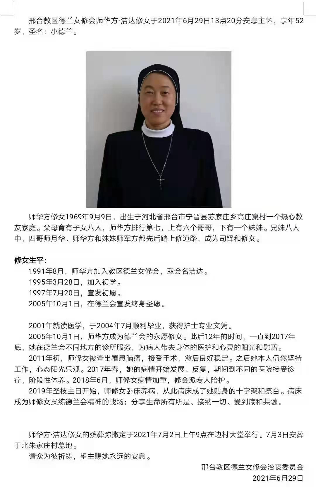 6月29日,河北宁晋边村德兰女修会治丧委员会发表讣告称,该修会师华方·洁达修女,因病医治无效,于2021年6月29日13时20分安息主怀,享年52岁。