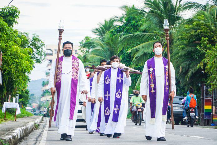 游行队伍从布隆甘主教座堂出发,神父们沿途扛着一尊十字苦像,最后抵达位于萨邦镇(Sabang)的显灵圣牌圣母堂。据LICAS新闻网报道,当天是该教区为祈求新冠疫情早日结束的“祈祷和守斋日”。