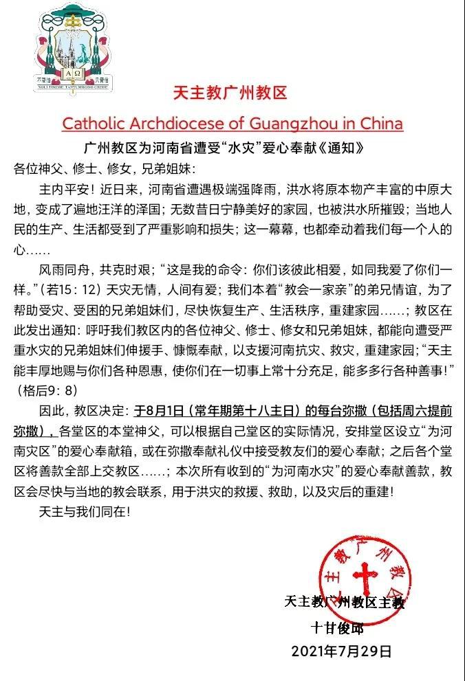 此外,广州教区亦于今天(7月29日)发出“为河南省遭受‘水灾’爱心奉献”的通知,在通知中,该教区甘俊邱主教鼓励信友们在8月1日的主日弥撒中为灾区捐款。在募集善款后,广州教区将与河南当地教会联系,将善款用于救灾及灾后重建工作。