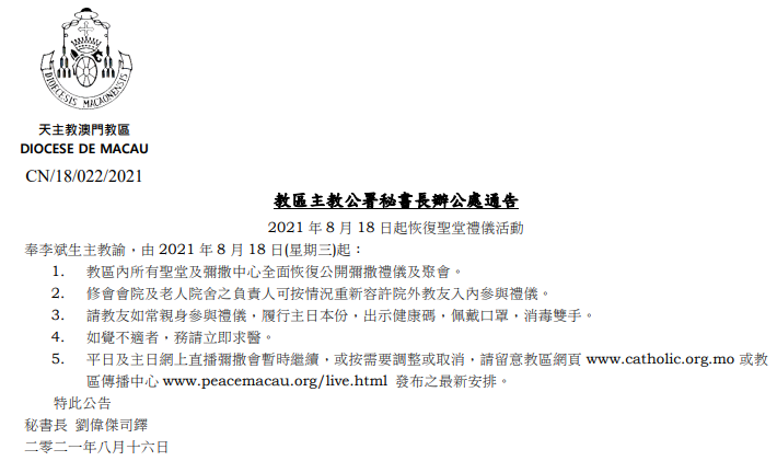 随着疫情缓解,澳门教区将于8月18日起恢复圣堂礼仪活动。据澳门教区官网8月16日刊载的该教区主教公署秘书长办公处通告称,自8月18日起,澳门教区所有圣堂及弥撒中心全面恢复公开弥撒礼仪及聚会。