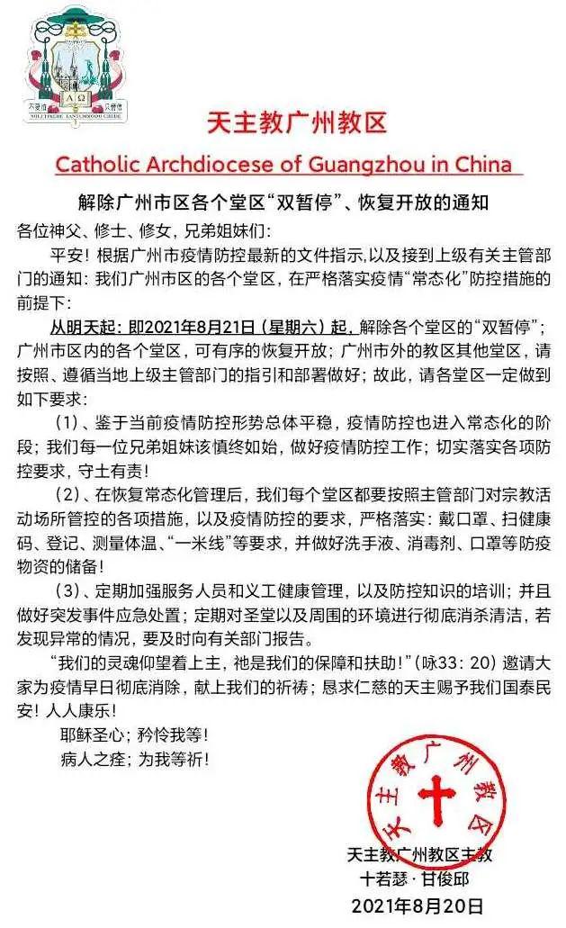 鉴于广州地区当前疫情防控形势总体平稳,广州教区将于明天(8月21日)起,恢复市区各圣堂的开放。此前,因疫情防控需要,广州市区各堂区圣堂自8月13日起暂停对外开放,暂停举行公开弥撒等聚集性活动。