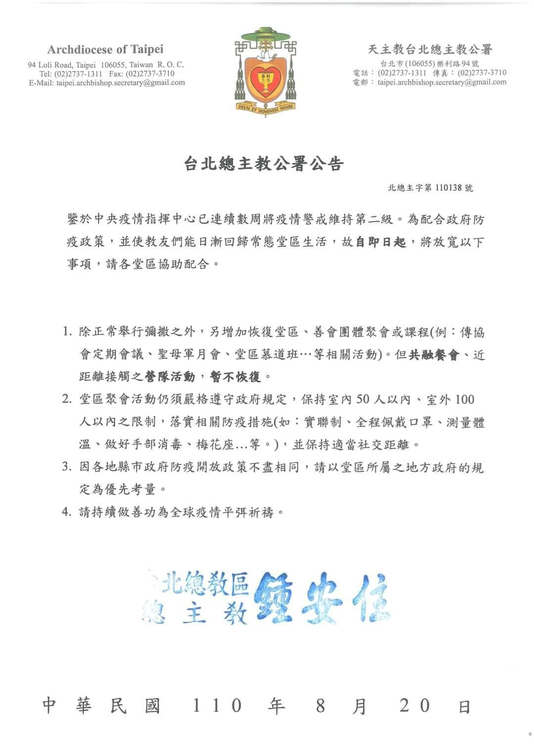 1.除正常举行弥撒之外,另曾加恢复堂区、善会团体聚会或课程。但共融餐会、近距离接触的营队活动,暂不恢复。