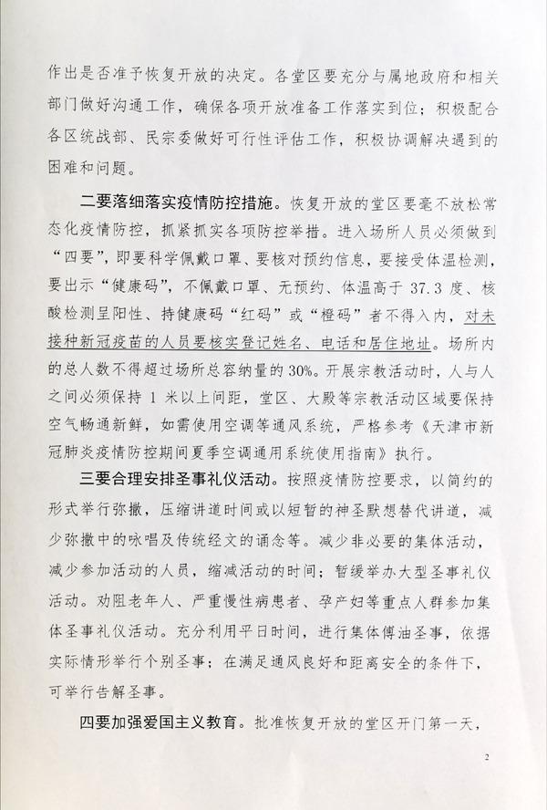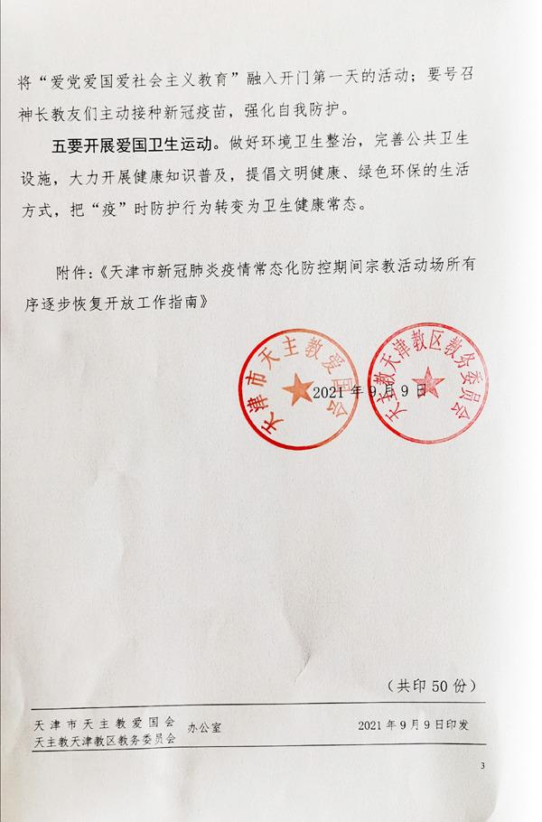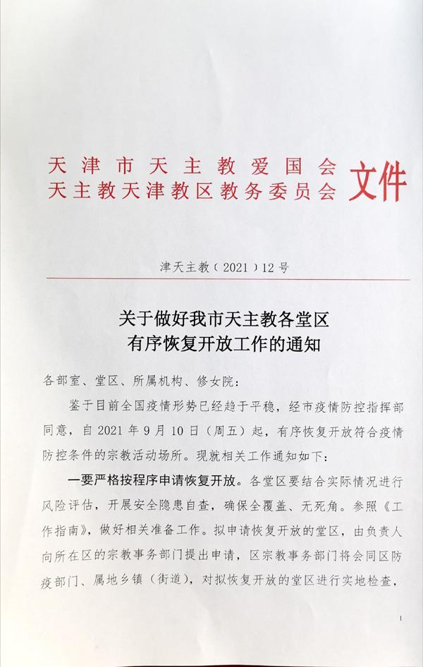 9月10日,天津市天主教两会发布通知,鉴于目前全国疫情形势已经趋于平稳,经市疫情防控指挥部同意,自当天起(2021年9月10日周五),天津教区各堂区、所属机构、修女院等有序恢复开放符合疫情防控条件的宗教活动场所。