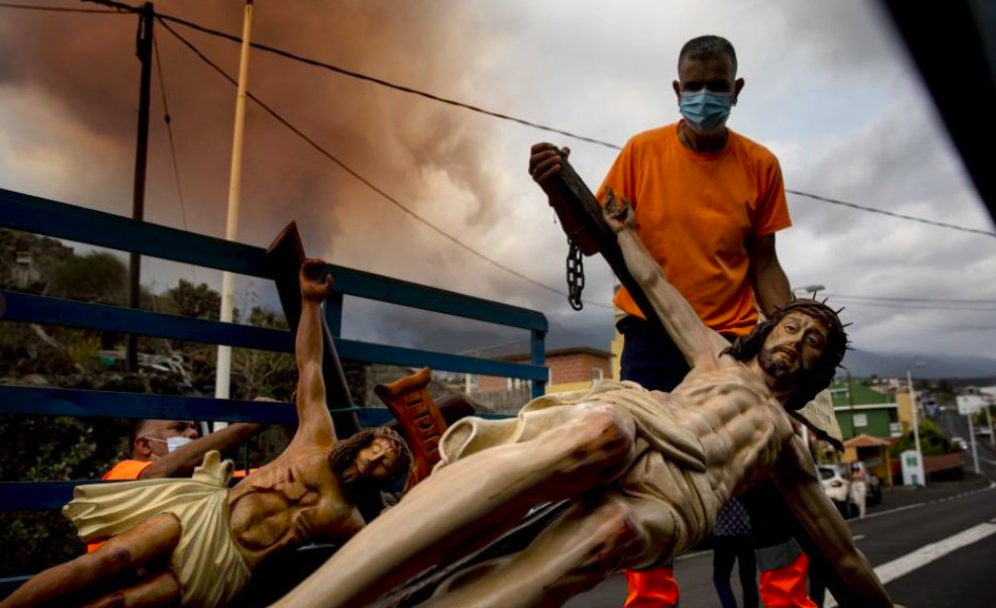西班牙加纳利群岛的拉帕尔马岛于9月19日发生火山喷发,火山喷发所产生的岩浆顺流而下,吞噬了至少150户住宅和200座建筑物。近日,大量火山岩浆正向当地的托多克(Todoque)靠近,而岩浆很有可能会淹没位于该地的圣庇护十世教堂。当地信友立即行动起来,抢救教堂。