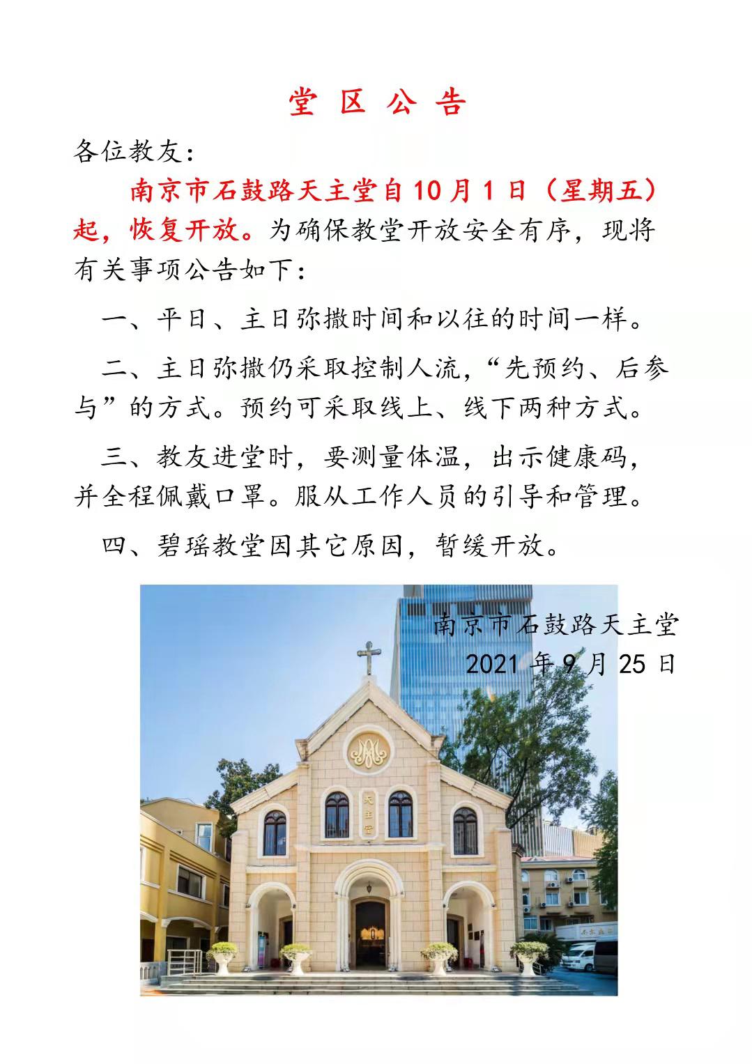 本台消息,今天,9月25日,南京市石鼓路天主堂发表堂区公告称,石鼓路天主堂将于10月1日(星期五)起,恢复对外开放。平日、主日弥撒时间和以往一样。主日弥撒仍然采取控制人流,“先预约、后参与”的方式。进堂时,教友必须出示健康码并佩戴口罩,测量体温。并配合服务人员的引导安排。此外公告声明:由于一些其他的原因,碧瑶教堂将暂缓对外开放。