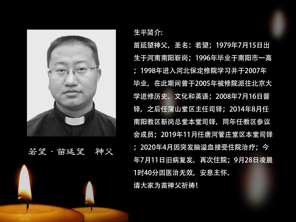据南阳教区秦神父介绍:苗延望神父,圣名:若望;1979年7月15日出生于河南南阳靳岗;1996年毕业于南阳市一高;1998年进入河北保定修院学习并于2007年毕业,在此期间曾于2005年被修院派往北京大学进修历史、文化和英语;2008年7月16日晋铎,之后任蒲山堂区主任司铎;2014年8月任南阳教区靳岗总堂本堂司铎,同年任教区参议会成员;2019年11月任唐河管庄堂区本堂司铎;2020年4月因突发脑溢血接受住院治疗;今年7月11日旧病复发,再次住院;9月28日凌晨1时40分因医治无效,安息主怀。